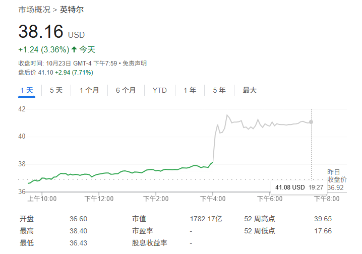 具体而言,英特尔第三季度营收136.5亿美元,同比增加2.8%,高于分析师预期的131.5亿美元;第三季度经调整毛利率40%,市场预估36.1%;第三季度调整后每股收益0.23美元,高于分析师预测的0.01美元,上年同期每股亏损0.46美元。